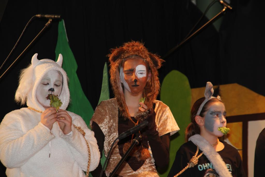 Evelyn als Ziege Berta, Mia als Hund Räuber und Mona als Goldesel.